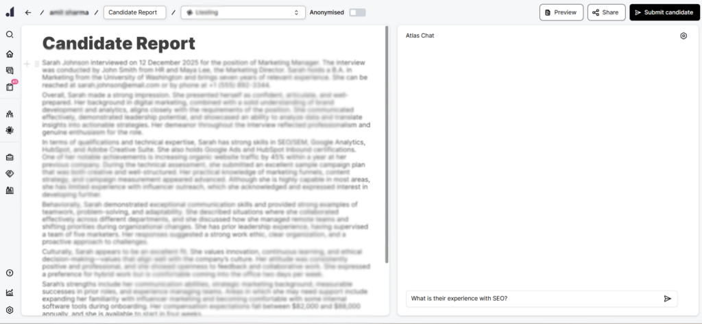 Another important feature is the ability to create a well-structured report for each candidate individually. With Atlas, you can open any candidate’s profile and generate a comprehensive report. You can ask GPT any questions you need, and it will provide accurate key points and produce a polished candidate report based on the transcript recorded during the interview.