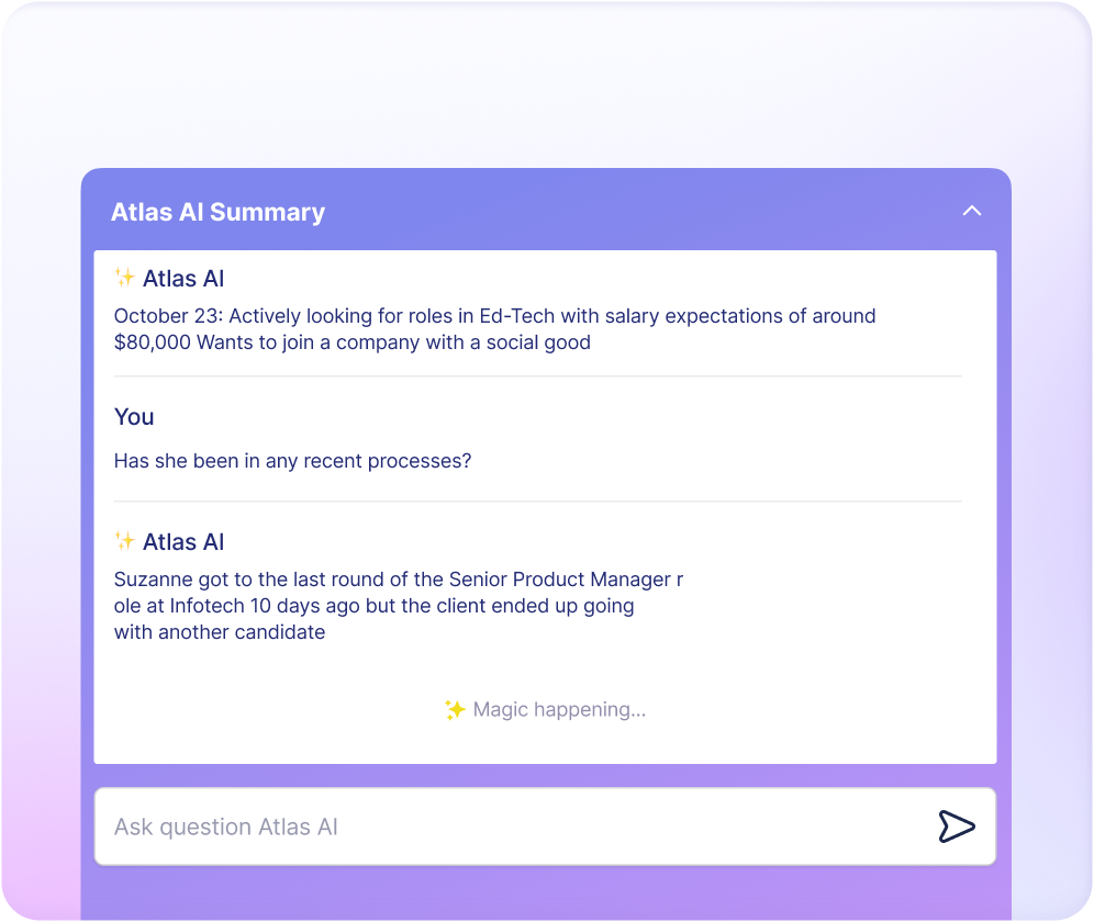 Loving the speed of Atlas and the support of the AI throughout the system. Asking a question and getting an answer is great; but it’s even better when you can quickly move/update/change the data on your candidates immediately and move onto the next task of placing great talent.
