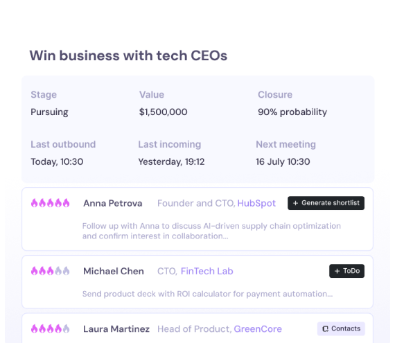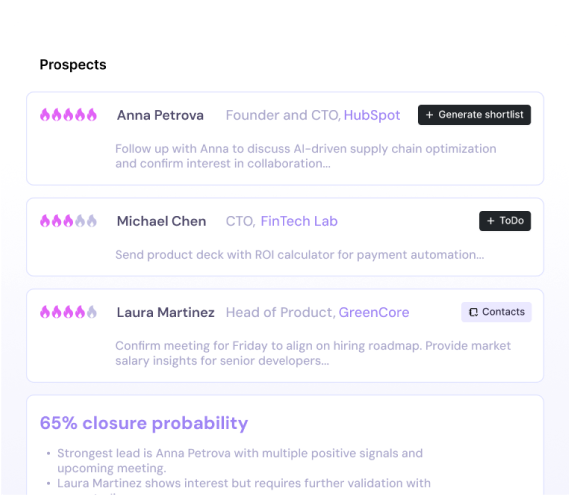 Atlas analyses, ranks, and scores every opportunity in real time to score interest, momentum, and potential, all paired with a probable likelihood of converting. Prioritise the most promising deals and stop wasting time on cold, disengaged leads.