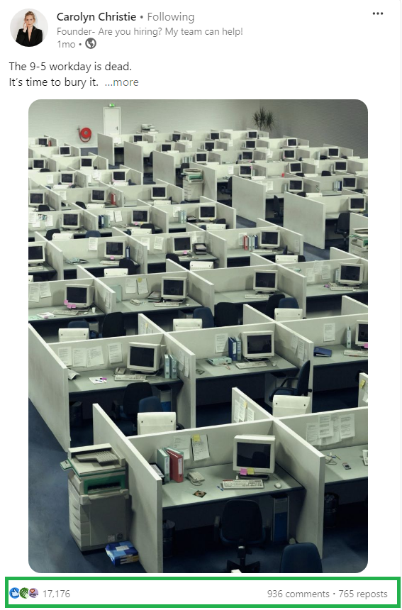 Take Carolyn Christie’s post about the death of the 9-5 workday, for example. It clearly hit home, racking up 17,176 reactions, 936 comments, and 765 reposts.