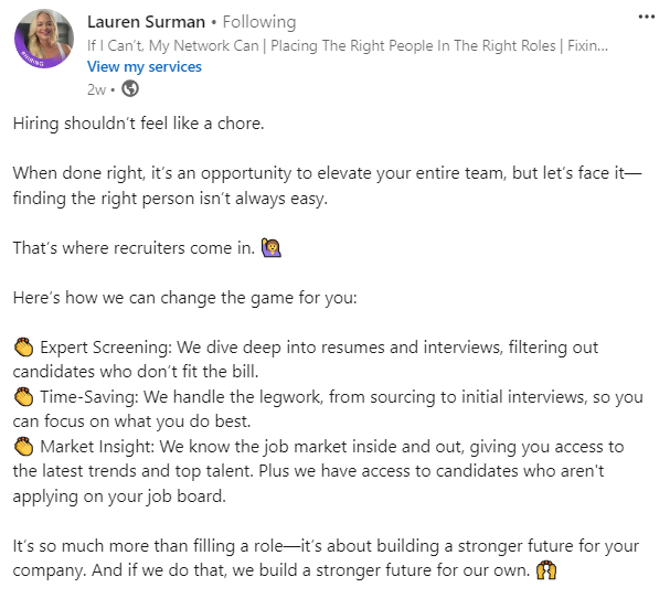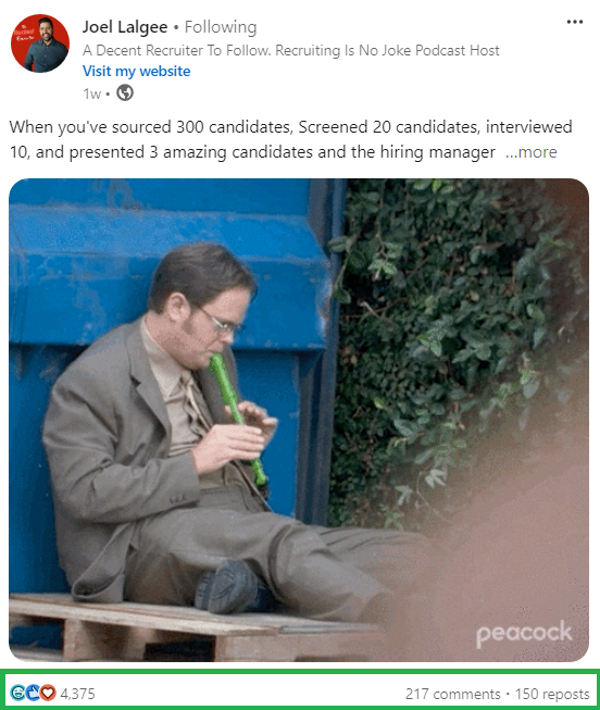 Talking about the real challenges recruiters face is a great way to connect, just like Joel Lalgee does in this post that got 4,375 reactions, 217 comments, and 150 reposts.