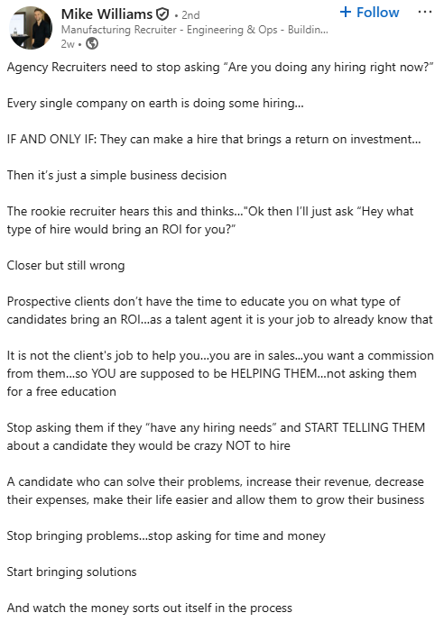 For agency recruiters, it reframes a critical moment in the sales process: the initial client conversation. Instead of asking open-ended hiring questions, Mike challenges recruiters to lead with solutions and insight.